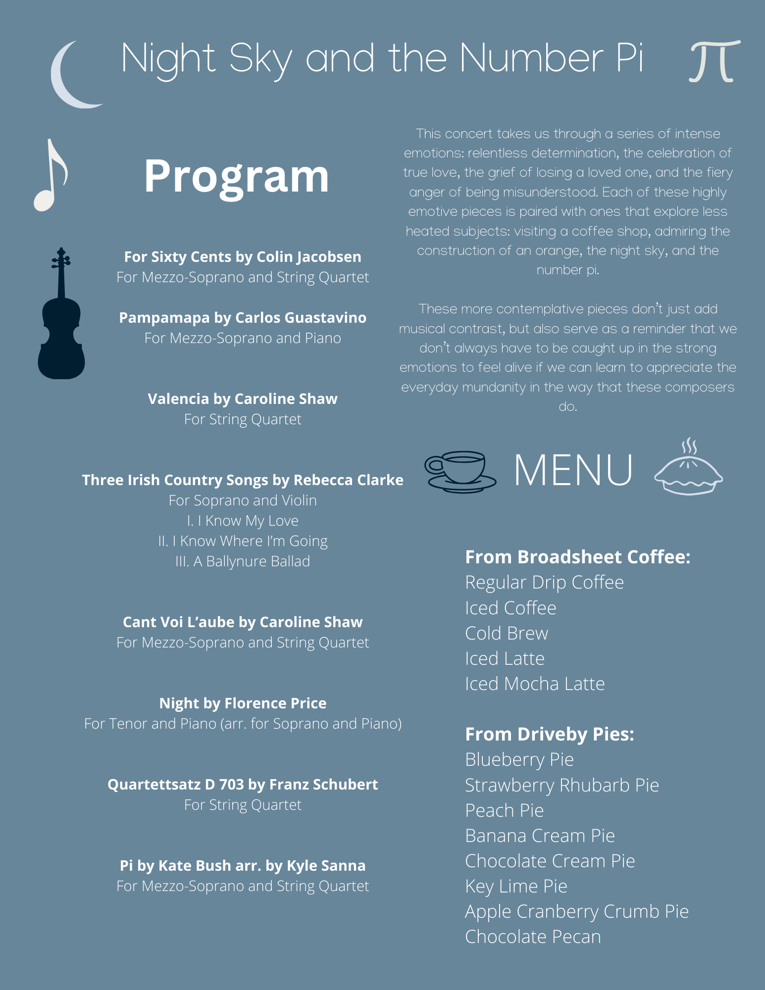 Night Sky and Number Pi is an hour-long chamber music program for voice, string quartet, and piano. This was curated as part of the Nova Fellowship at the New England Conservatory and in collaboration with local Boston businesses Broadsheet Coffee and Driveby Pies. This concert was created to provide a unique chamber music performance opportunity for NEC students, encourage collaboration between the string, piano, and vocal departments, utilize the Bower Stage as a compelling performance space, highlight underrepresented composers, push the creative boundaries of a typical chamber music concert experience, and create an enjoyable event for all members of the NEC community.